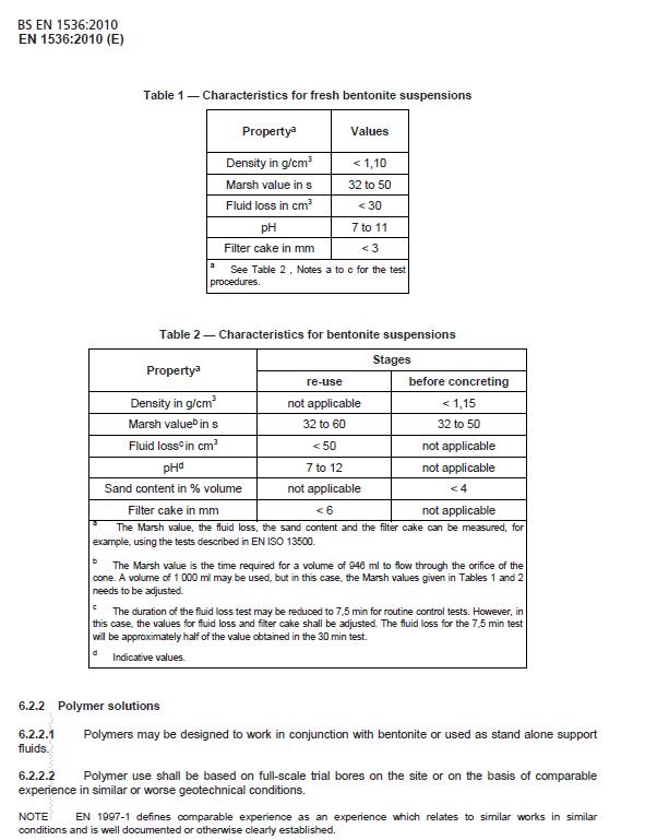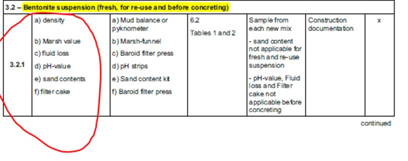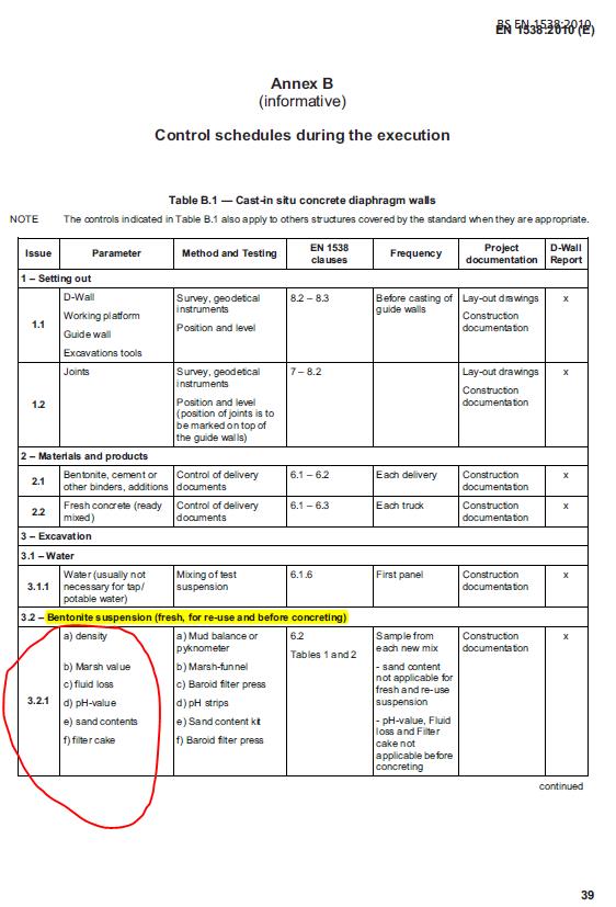 Σύμφωνα με το πρότυπο EN 1536 - Bored piles ισχύουν τα παρακάτω σχετικά με τους ελέγχους και τις δοκιμές του αιωρήματος μπεντονίτη:
